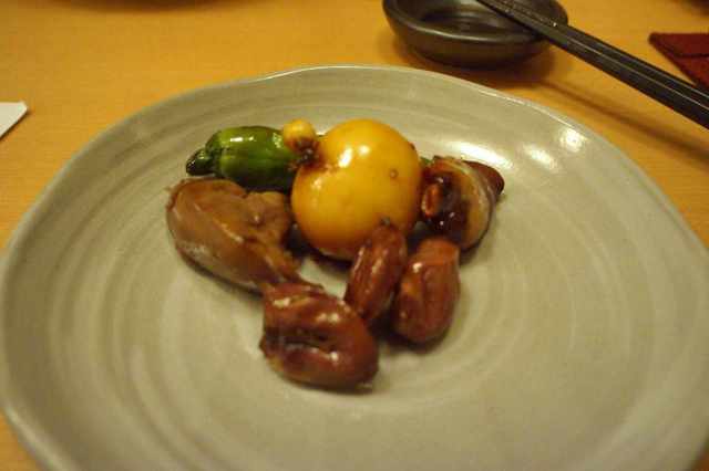まずは小皿に入った、各種内臓や湯葉等を使ったお通しを頂くと