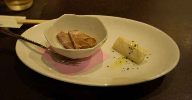 突き出しの豚肉のチャーシューの様な物とマコモダケを焼いたもの。味はあっさりめで結構うまい。
