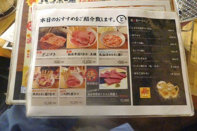早速メニューを見ていくと、ドリンクメニューはハイボール、ビール、ハイサワー、カクテル、マッコリ、焼酎、日本酒、ワイン、梅酒、ソフトドリンク、予約制の2時間コースの案内、仙台牛の部位マップや、仙台牛のクオリティの高さを示したPOP、本日のおすすめメニュー、本日イチオシコースメニュー、治郎丸風にお肉1枚づつ注文できるメニュー一覧※1人前でと発言した場合には3枚セットで出てくるそうです。1品メニュー、ご飯スープ、焼き野菜、冷菜、数量限定メニューで以上です。