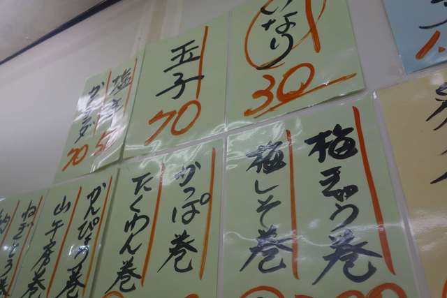 店内にも多数メニュー表があり、美味しそうな穴子寿司、各種巻き巻き寿司、10円寿司以外にも2桁ネタ寿司もいっぱい用意。