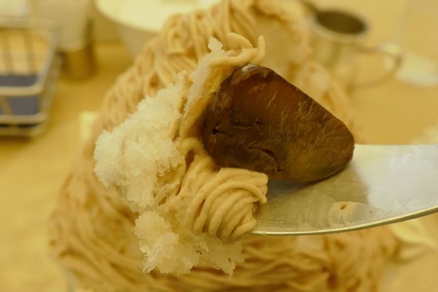 かき氷の頂点に刺さったマロングラッセは大きくホクホク!甘味も濃厚!