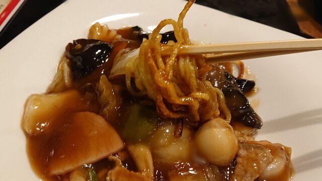 五目あんかけ焼きそばの餡ですが、甘み+甘み、香辛料が絶妙に絡み合い本当に美味しいです。麺もカリッとした部分と柔らかい部分があり、麺とまざり最高級のあんかけ焼きそばでした。