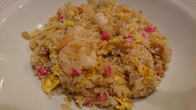 五目炒飯ですが、味や香ばしさ、叉焼、エビ全てのバランスが良くなかなかこのような炒飯に出会いません。