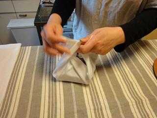 お菓子の量に合わせさらしの生地をピンキングはさみでその場でカットして包んでくれます