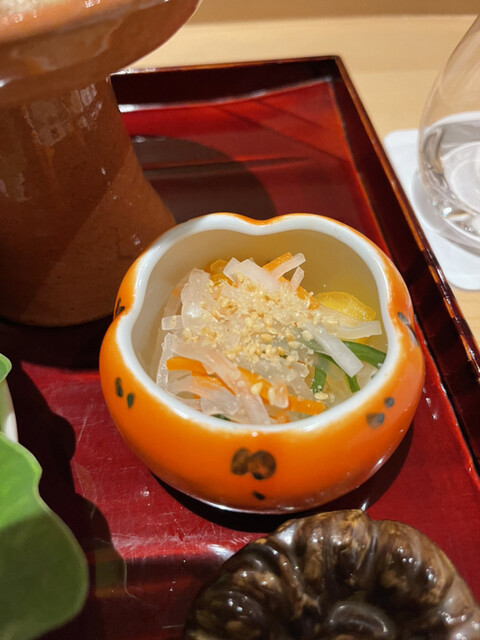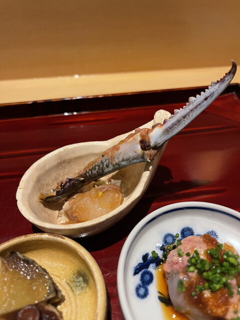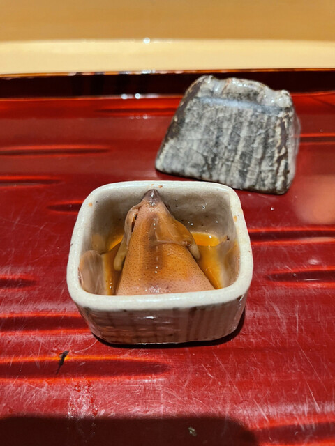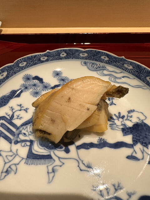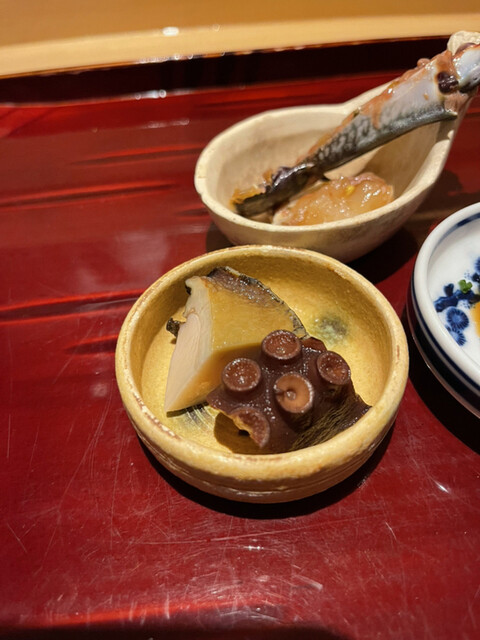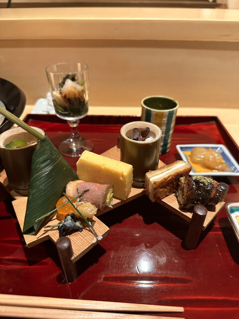 八寸:筍木の芽和え 赤こんにゃく えんどう豆に塩雲丹 ほたるいか 卵しんじょう 蓮根 何とかの卵 きゅうり 煮たこ 貝