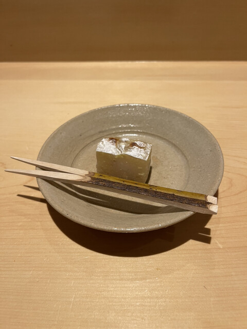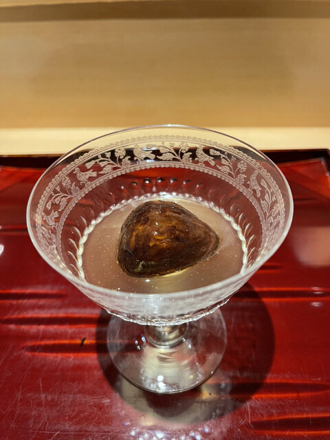1皿目は煮こごりをかけた千葉勝浦の鮑と北海道の牡丹海老。