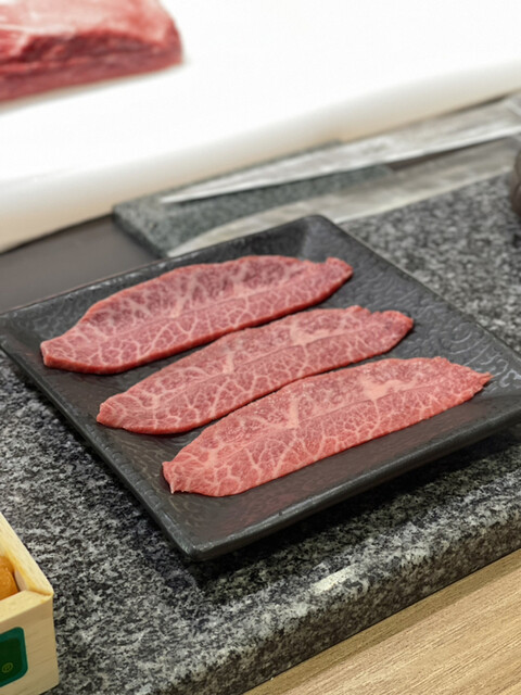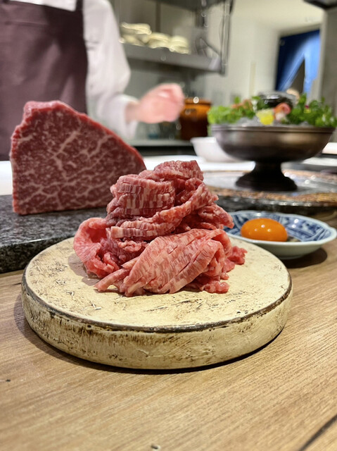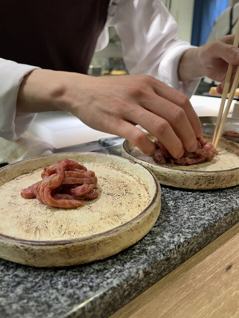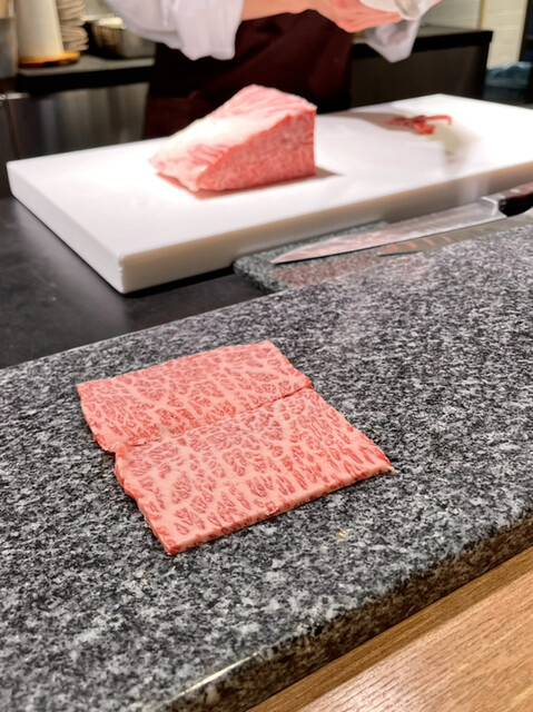 お肉を丁寧にカットして、これくらいでいいですか?うん、足りないですね、と