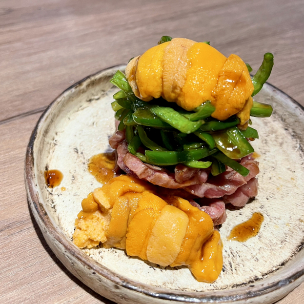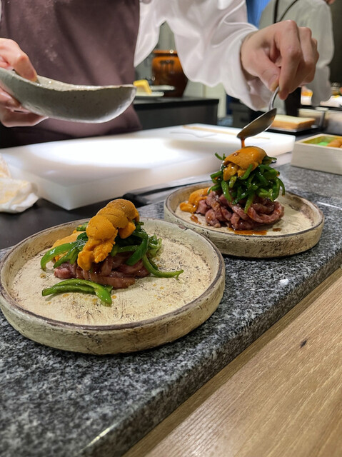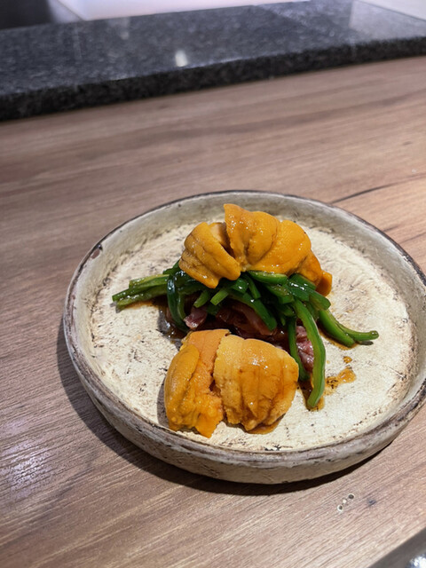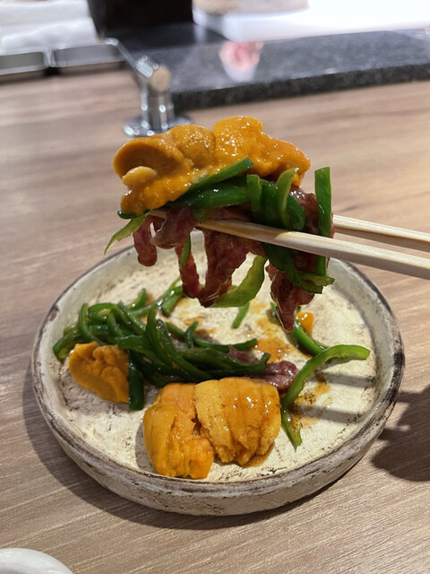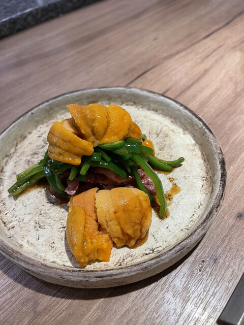 ん?青椒肉絲に雲丹?いや、次の料理の準備かな?