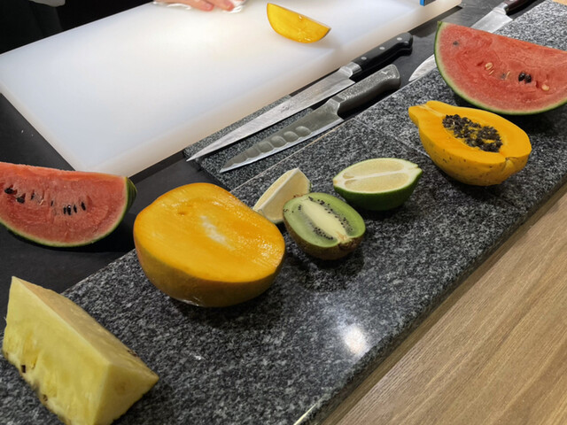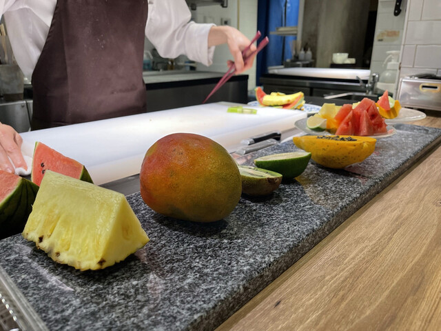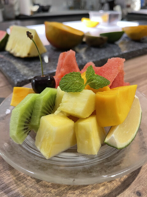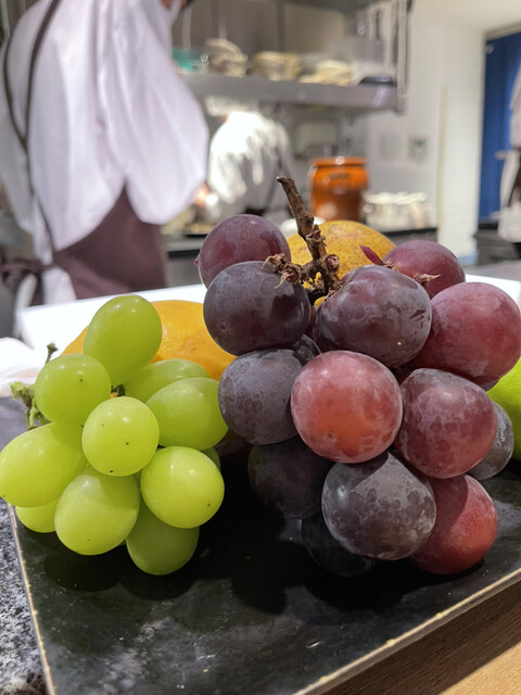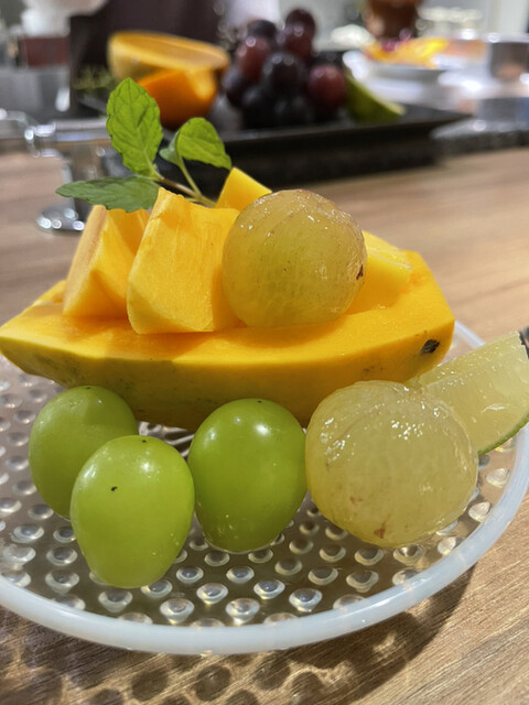 旬のフルーツは、めちゃくちゃデカイぶどう、シャインマスカット、キウイ、マンゴー、パパイヤから好きなものを好きなだけ♪