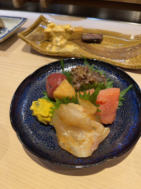 くえのお造り、辛子茄子、明太子、梅干し、牛時雨煮…