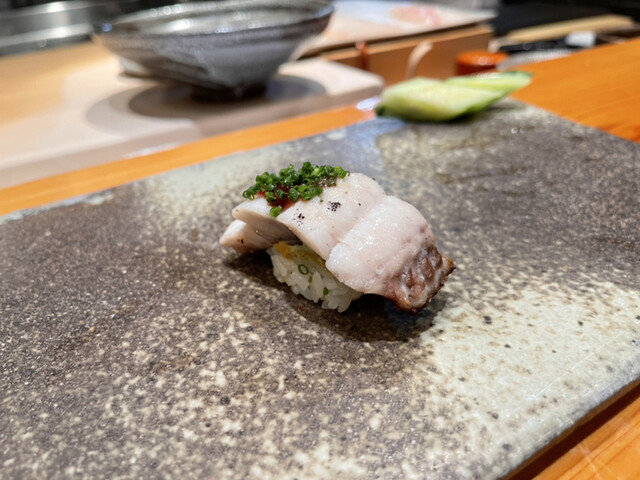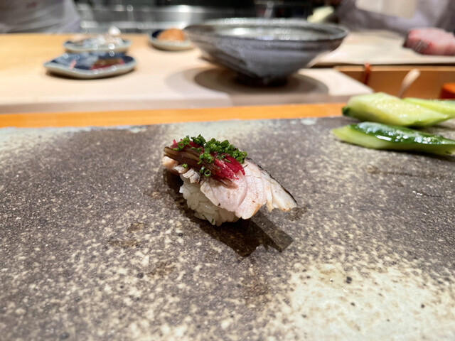 〆鯖は炙り、刻んだ羅臼昆布が乗っていて脂の乗った鯖と昆布のネバネバの組み合わせは