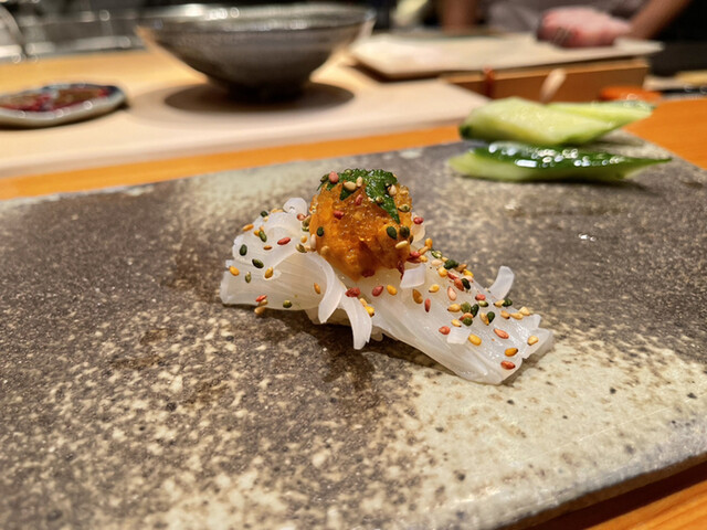 いかの甘さ、雲丹の旨味、胡麻のプチプチ食感に、爽やかなカボス。