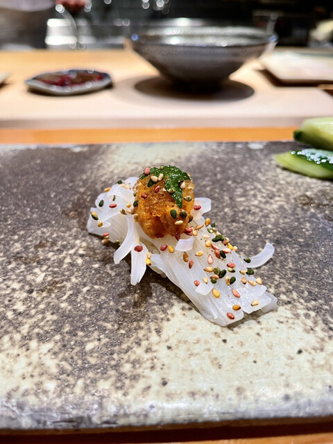 鯛には、肝を乗せて、めちゃくちゃ濃厚な味わいに。