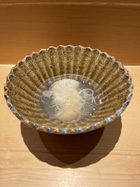 初めて見るお皿だ〜と思ってたら定番の鮑と煮蛸の登場。
