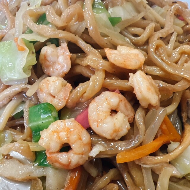 キャベツなどの野菜に小エビ、豚肉、イカゲソが入りうま味を吸ったもちもちの麺がたまりません。