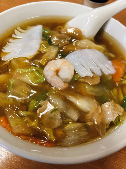 中華そばベースにイカ、エビ、豚肉に野菜たっぷりの餡が乗りコクとうま味たっぷりのスープ(^^♪