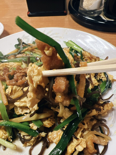 中華定食のおかずは豚肉、筍、木耳、ニラに溶き卵をオイスターソースベースの中華タレで炒めた所謂ムーシーロー(或いはムースーロー)的なもの。