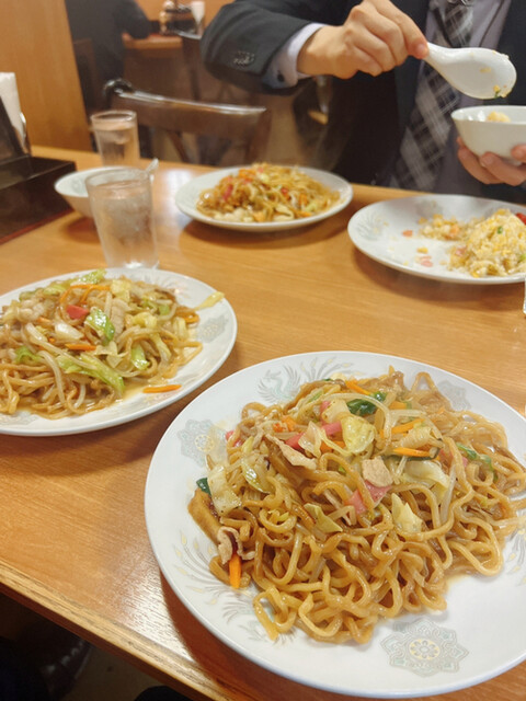 いつもは皿うどんや焼きめし、麺類などを単品で食べるけど昨日の寿司1.5人前の食べっぷりからして単品では足りないだろうと3人でしたが皿うどん3人前にやきめし1人前をみんなでシェアすることを提案しその通りにオーダーすることに♪