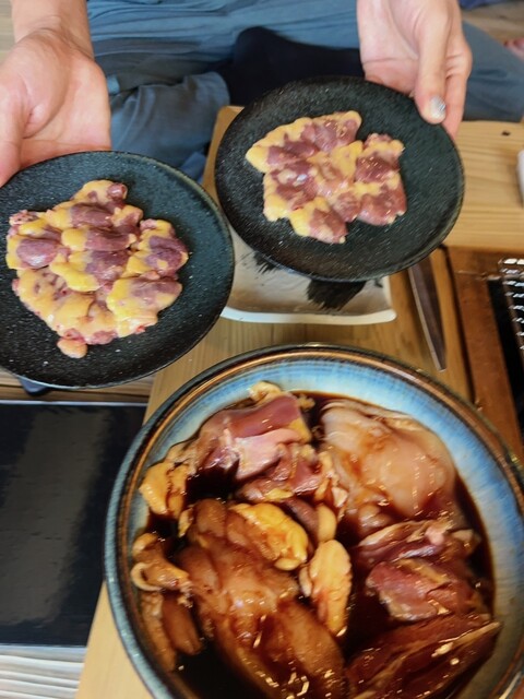 今回オーダーはタレ焼き(もみじ鳥の親鳥)、ちっごどり塩焼き(塩焼き専用に飼育)、レバー(特選が売り切れで普通の方)、皮タレ、ホルモン、鳥ソーセージ、プレミアム椎茸、玉子(ひとり2種類・2個)に白ごはん(若者のハンドルキーパーは大3杯!)!