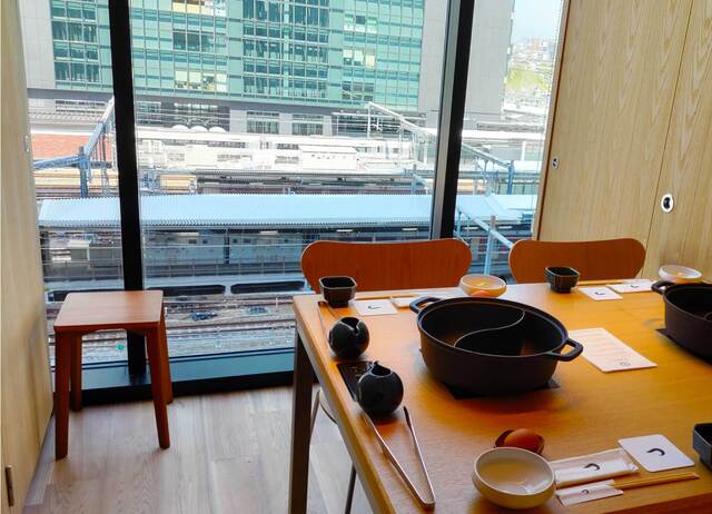 窓からは眼下に線路を見ながら低い椅子でゆったりといただきました。以前の下見の時はカウンター席で椅子が高く、椅子の下に荷物を置いて食事をしましたが、今回は荷物を置くカゴもありました。