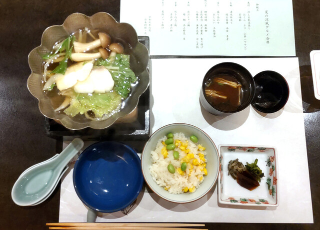 5月にいただいた「花座会席」より1,000円お安いので内容を心配しましたが、遜色なく美味しかったです。特に今回の炊き込みご飯はトウモロコシと枝豆が入っていて、今までいただいた炊き込みご飯の中で一番美味しく思いました。