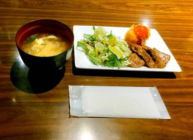 先にドリンクがきて、それからお味噌汁、次に牛ハラミステーキとカニクリームコロッケにサラダが添えられたお皿、最後に「クラムチャウダーオムライス」がテーブルに広げられました。