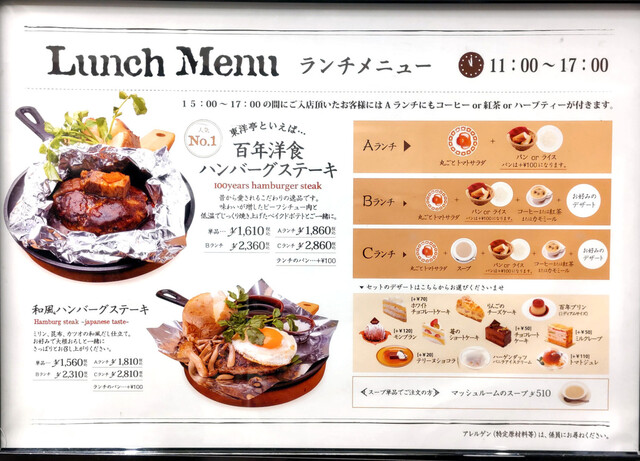 「まるごとトマト」は今回は滋賀県産で酸味がたまらなくいい感じでした。また、「生ハムとモッツァレラチーズのサラダ」は癖になる美味しさです。「百年洋食ハンバーグステーキ」は湯気をシューシューと出しながらの登場で、圧巻でした。ライスを思わずお替りしてしまいました。勿論、追加料金は発生しません。デザートのモンブランは濃厚なお味でアイスコーヒーの苦みとマッチして至福の時間を満喫させてくれました。ご馳走様でした。