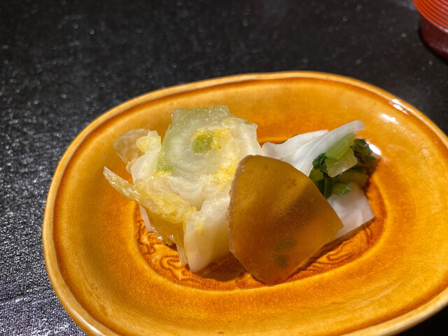 和牛の八幡巻のよう。海老芋がお肉に巻いてあります。味はしっかりついており、芋の体積が大きいので思った以上に重い。金柑と胡麻和えで口直ししながらいただきました。金柑水煮が美味しい〜〜
