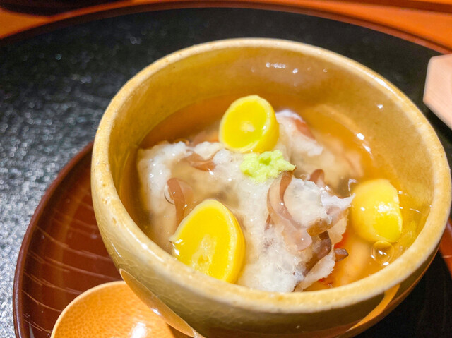 蕪蒸し。中身は金目鯛、銀杏、木耳。わさびがアクセント、食感の違いに木耳が登場し終始お口の中は楽しい。