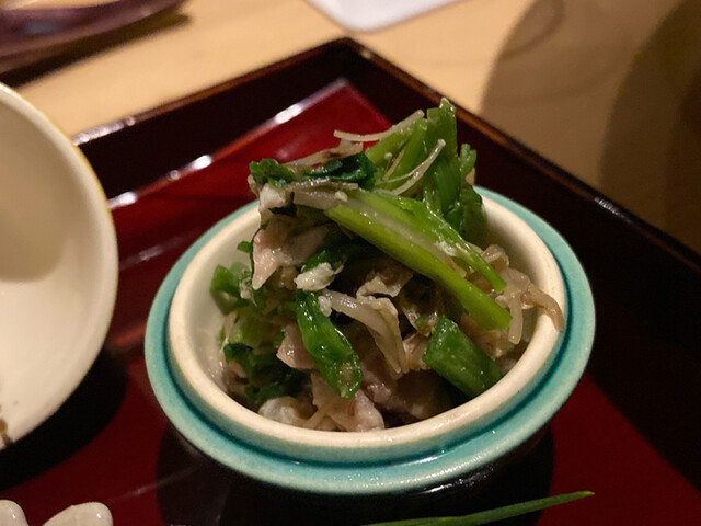 伊勢海老のミソをそのままに、身が崩して乗っけてあります。さらに菜の花、鏑庵、柚子をパッとかけてます。海老のミソを鏑庵と身と混ぜながらいただきます。鏑庵に無駄な味付けがなく、香りがしっかり立っている。ミソと絡まって良い感じ、しかし終わりがわからない、どこまでも中身を掻き出して食べ続けたい一品。