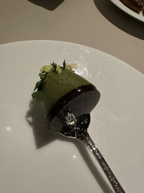 きゅうりのゼリーは、瓜=ウリの味を出しながら、イクラには和の出汁と思われる旨味のエッセンスが隠れているも、醤油感が一切ないも、クリームで包まれることでフレンチになる。