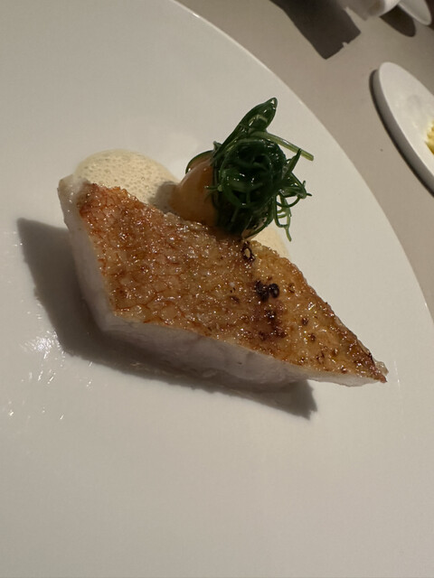 網走産キンキ コシヒカリ米 レモンバーベナ:キンキ、鱗をパリパリに このソースも、キンキの濃厚なストックに、甘く爽やかなレモン香が加えられることで、旨濃いものが、同時にかろやかに振る舞うという相反することが自然に起きています コシヒカリのおいしさは旨み、甘み、粘りの3大要素でしょうけど、米つぶをひとつずつソースに絡めて、コシヒカリ固有の旨み、噛むことで、つぶが潰れる時に出る甘み、そして、リゾットの如く歯応え感と共に、粘りを感じる ダニエルchefによるコシヒカリという品種の解釈をこめ一粒ずつ口にすることで、食べ手に伝えようとしているのでしょうか?このあたり、会話できたらいいなぁ