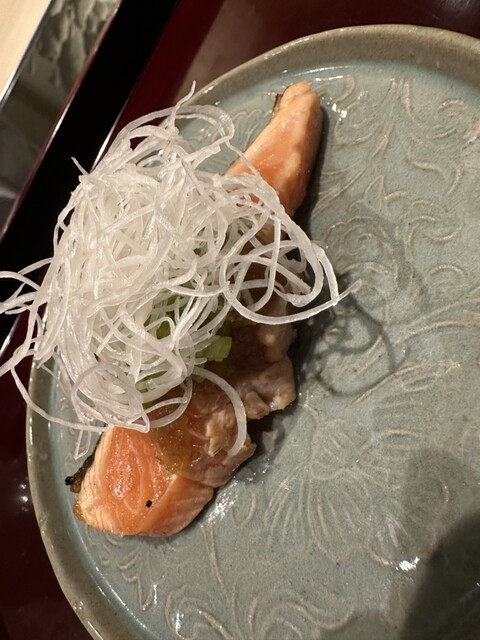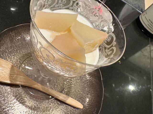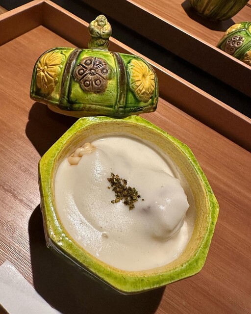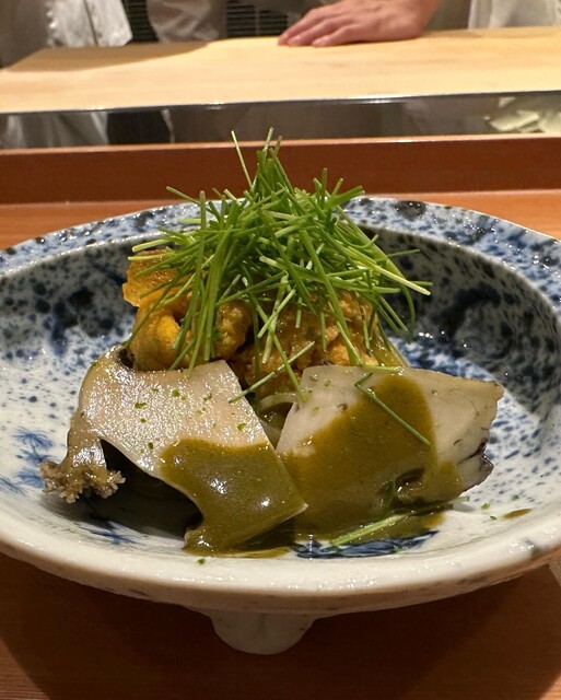 揚げ鱶鰭、晴山さまの鱶鰭は揚げることが多いですが、とろみの餡とよくあっており、揚げることで乾物感を減らしたい意向なのか聴いたことはないですが、和食としては中華の乾物臭は合わないと思うので、良いと思います。とにかく、美味しく仕上がってるので、間違いないのでしょうし、中華的な姿煮で出てきても、その時に美味しいと思って、きっと満足してるのでしょうけどね。