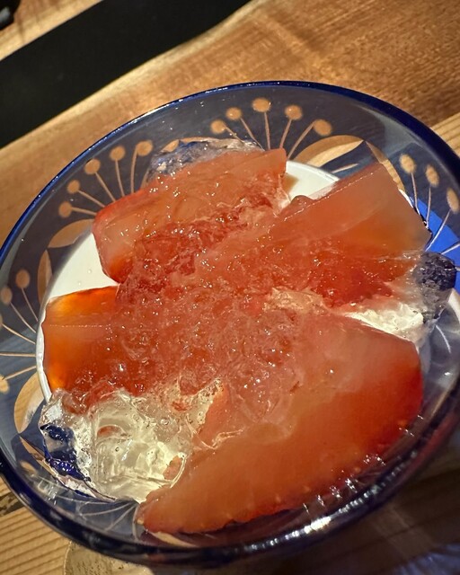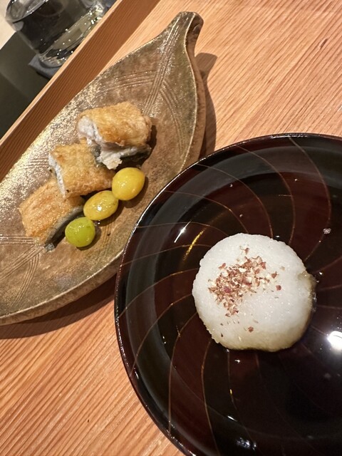 茹で鱧より、鱧の身が生仕立てで、よりマッタリねっとりと口福。鱧の子も、旨味がぎっしりと詰まって、ポン酢添えて、そのままシャンパンの肴になるタレでした。