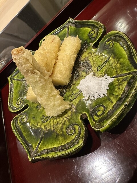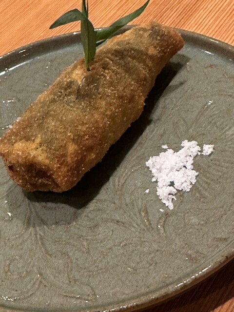 日本のお野菜も力強い味を持つものがたくさん増えてきましたが、国産のホワイトアスパラも欧州でいただくものと同格に艶やかな味です 揚げたアスパラの衣とホタルイカの濃厚な味がよく空いますが、各々の単品としても美味しい なめろうはそのままおつまみにもなりますし
