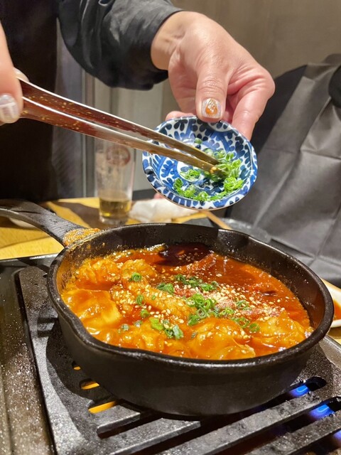 コースにも出てくる厳選ホルモンは、仕上げを目の前の鉄板でグツグツ煮込んでいきます。