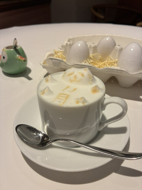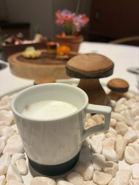続くアミューズの小皿はバリエーション豊富で、トマトチップ、シャインマスカット、山椒のビスケット、栗粉のネーチ、ビーツを練り込んだパスタフリットなど、小さなひと品ごとに食感と香りの振れ幅が大きく、ひとつずつ手に取るたびに気持ちが切り替わるようでした。竹炭をまとわせ黒トリュフを模したライスコロッケも印象的で、外観の遊び心に対して中はしっかりと穀物の温かさを感じられる仕立てでした。マッシュルームのカプチーノ仕立てのスープです。泡立てたミルクが重なり、口当たりは滑らかでありながら、奥にはしっかりと茸の香りが息づいています。