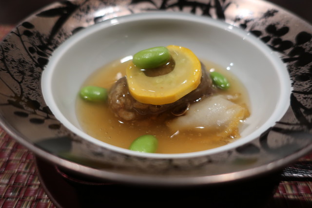温菜(牛蒡饅頭) 揚げ鮑に、ズッキーニ、枝豆。生姜庵がかかっています。
