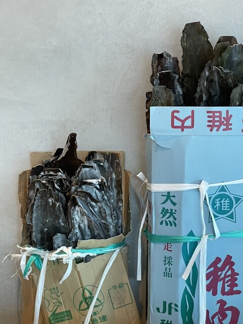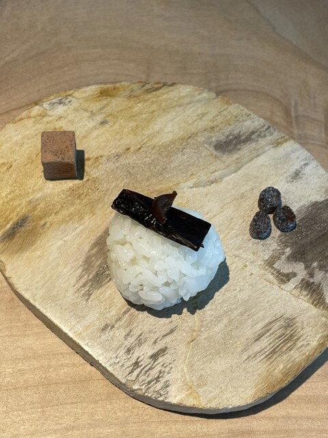 店内は、コンクリートと一枚板のカウンターが織りなすシンプルで美しい空間。まず、ロウリュウのように昆布をあおぎ、立ち昇る海の香りに包まれます。次に、利尻、真昆布、羅臼の3種類の昆布だしをワイングラスで飲み比べ。昆布の奥深い香りと旨みを感じるテイスティングに、心を奪われます。