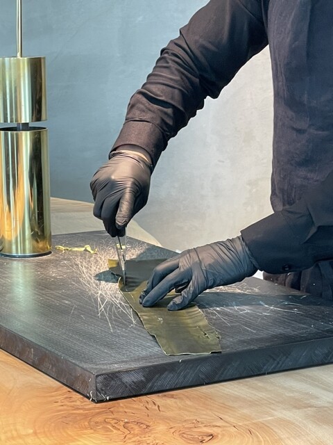 まずは、昆布だしのテイスティングからスタート。水と昆布だけで取った澄んだだしを一口飲むと、舌がリセットされ、昆布本来の繊細な旨みが感じられます。さらに、目の前で職人がおぼろ昆布を削り、出来たてを試食させてくれるという粋な演出も。ふわふわとした食感と豊かな香りは、ここでしか味わえない特別な体験です。