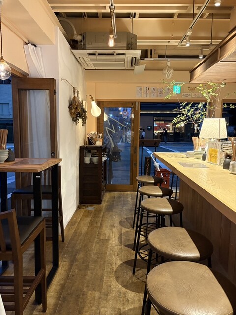 外から中の様子が見える全面ガラス張りのため、初めてでも入りやすいのが嬉しいポイント。店内は木材を基調とした和モダンな空間で、落ち着いてゆっくり過ごせます。1階はカウンターや立ち飲み席、2階はテーブル席があり、様々なシーンで利用できます。