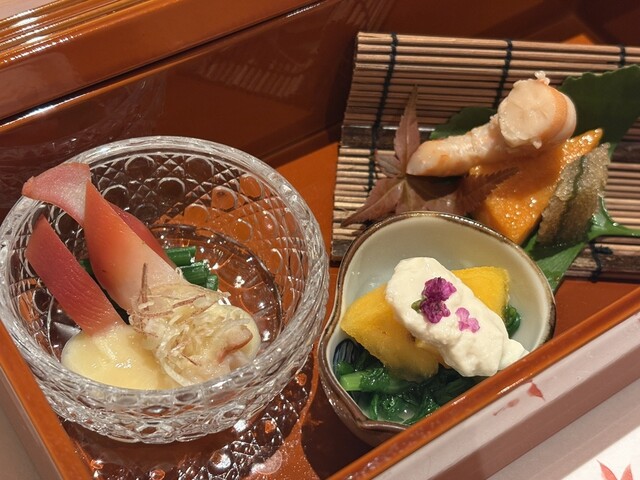 ●芸術的な先付:季節の彩り豊かな先付からのスタート。ホッキ貝のぬた、柿の白和、天使の海老、子持ち昆布が美しい器に盛り付けられ、まるで一つの芸術品のよう。繊細な味付けに、和食の奥深さを再認識させられます。