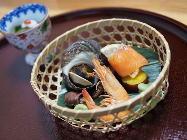 八寸 栄螺サーモン蓬麩丸十蜜煮子烏賊一寸豆海老旨煮