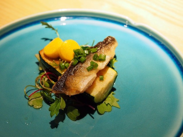 四万十川の鮎だそうですが鮎のフリットのうまさはもちろんですが程よい硬さに火が入ったズッキーニのうまいのなんのって写真じゃ分かり難いかも?自家製魚醤の香りと旨味に鮎のワタの旨味と苦みがしっかり目に感じる塩味とも合わさってとにかく非常に美味しい逸品でした。スタートの一皿目でやさしい味わいの鶏肉の次がこのガツンと来る風味の前菜、あぁ食欲に火が付きます。