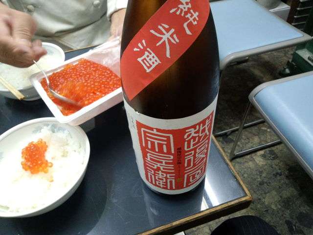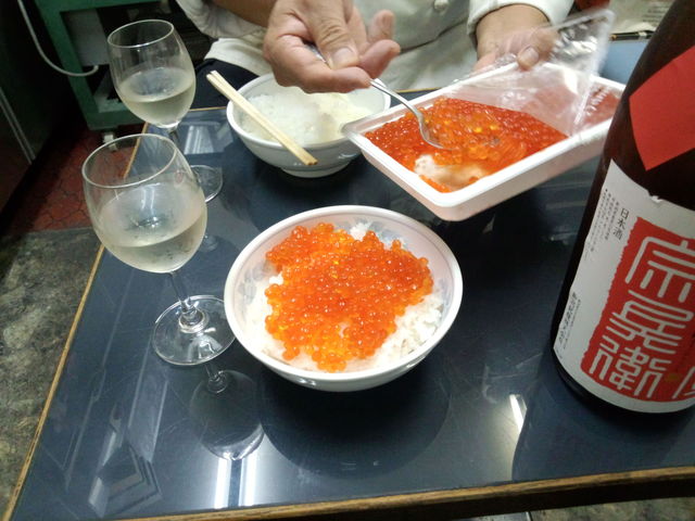 ご主人と八海山の酒とイクラ丼で乾杯や!