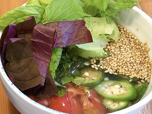 そこに旬のトマトやしそ、ハーブの葉が入ります。