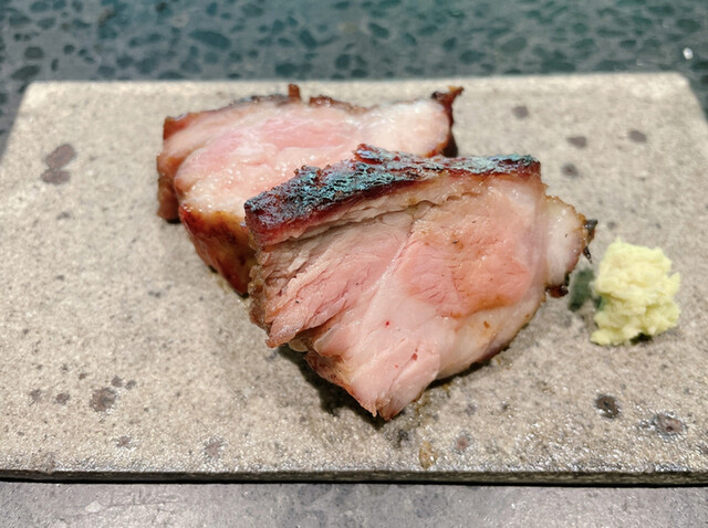 チャーシュー。コクがあり柔らかい。甘いタレの味とほのかに香辛料。わさびが美味しい。