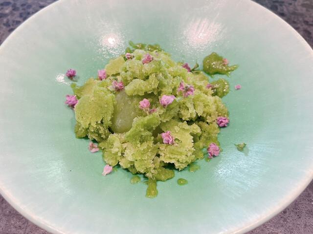 と言う名前ですがデザートです。大葉のシャーベットが予想以上に好み。中にある果肉は何かと思いましたらライチフレーバーのミニトマトでした。グリーンのカクテルとビジュアルも合います。