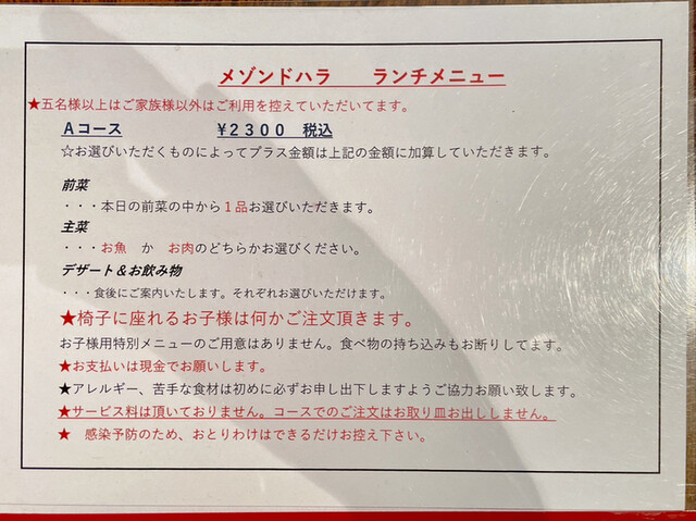 ランチメニューはコース(2,300円)で前菜・主菜・天然酵母のパン・デザート・ドリンクとなります。