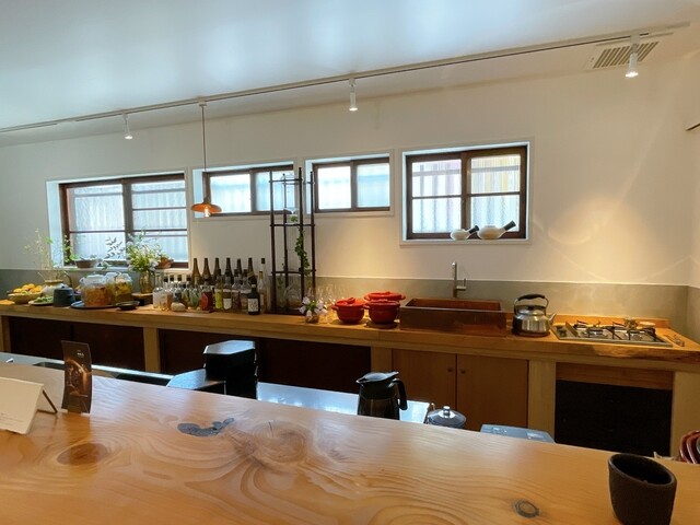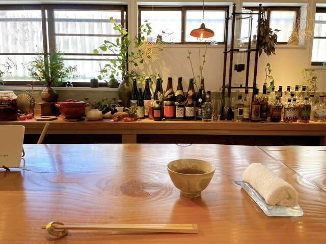 カウンター前にはさりげない植物やアルコール類、酵素ジュースの瓶、タワー型の水出しコーヒーメーカーなどがセンス良く並んでいます。